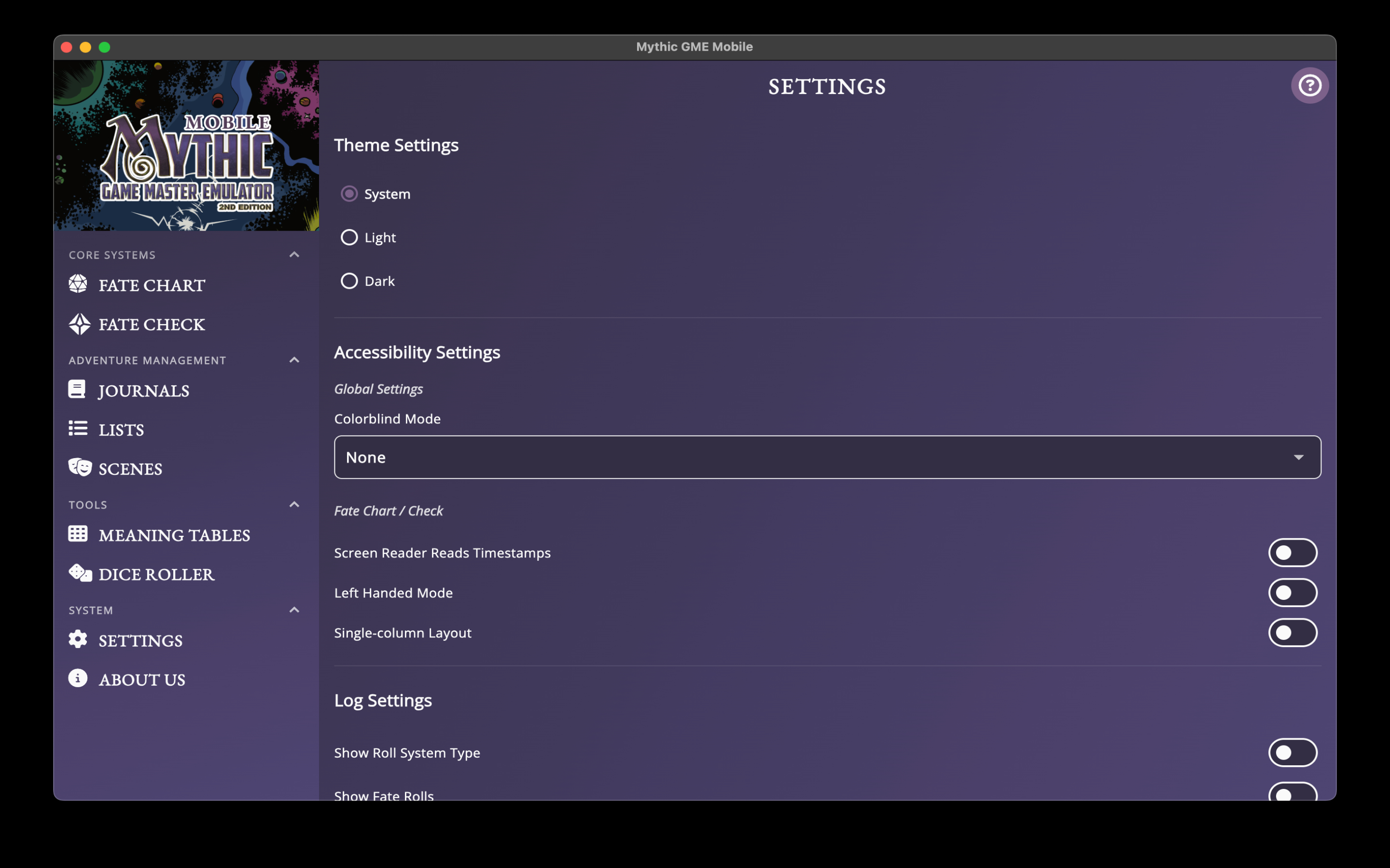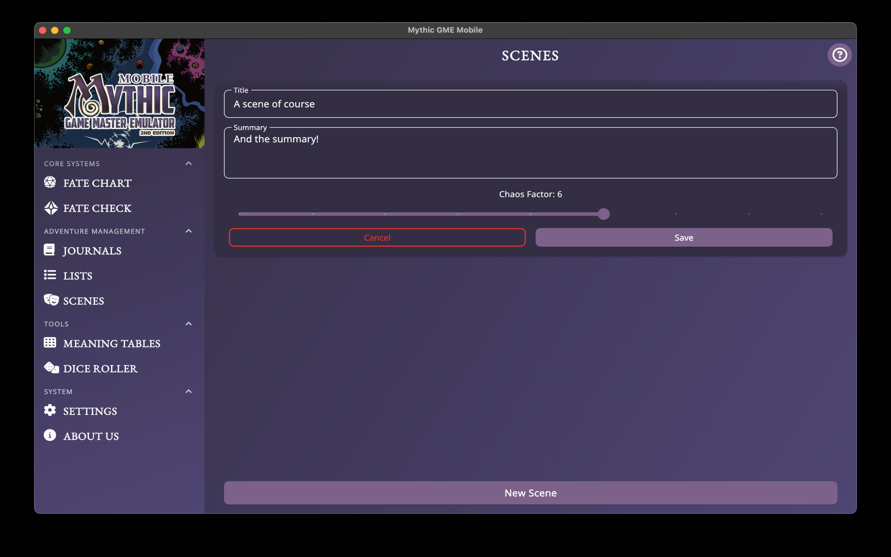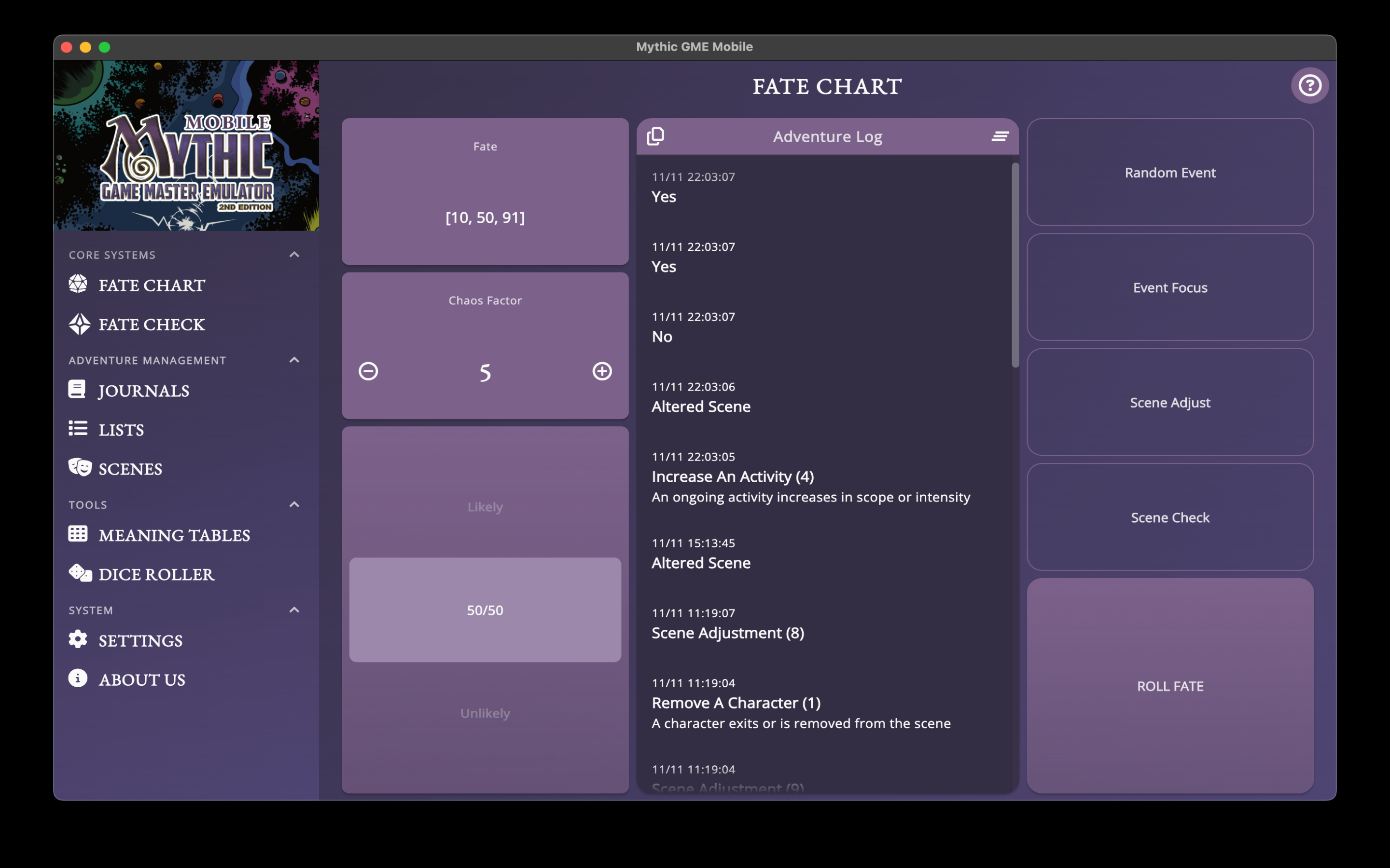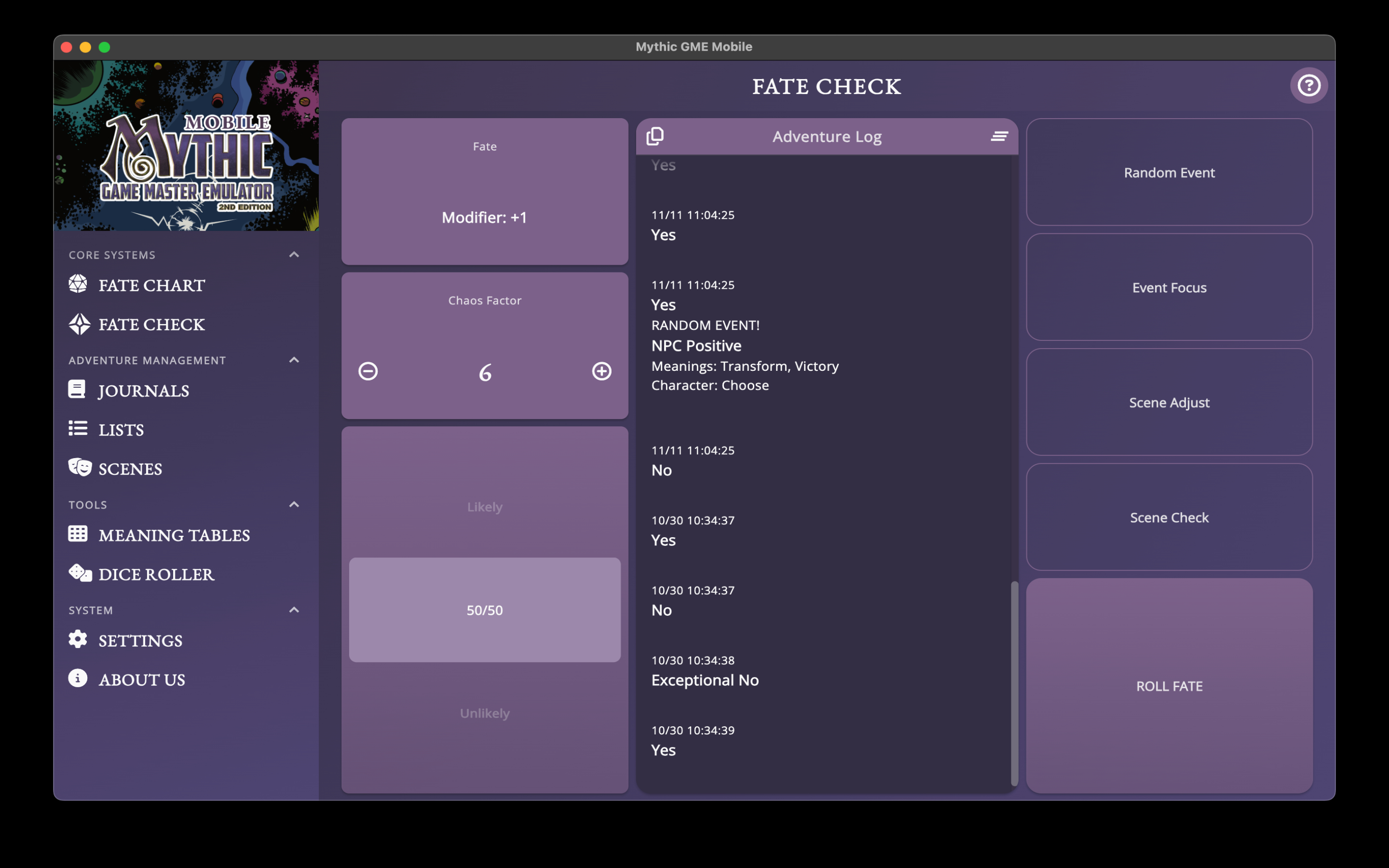 A comprehensive cross-platform implementation of Word Mill Creative's Mythic Game Master Emulator 2nd Edition. Built with Flutter using MVVM architecture and Provider state management, this app brings the power of Mythic GME to mobile devices and desktops.